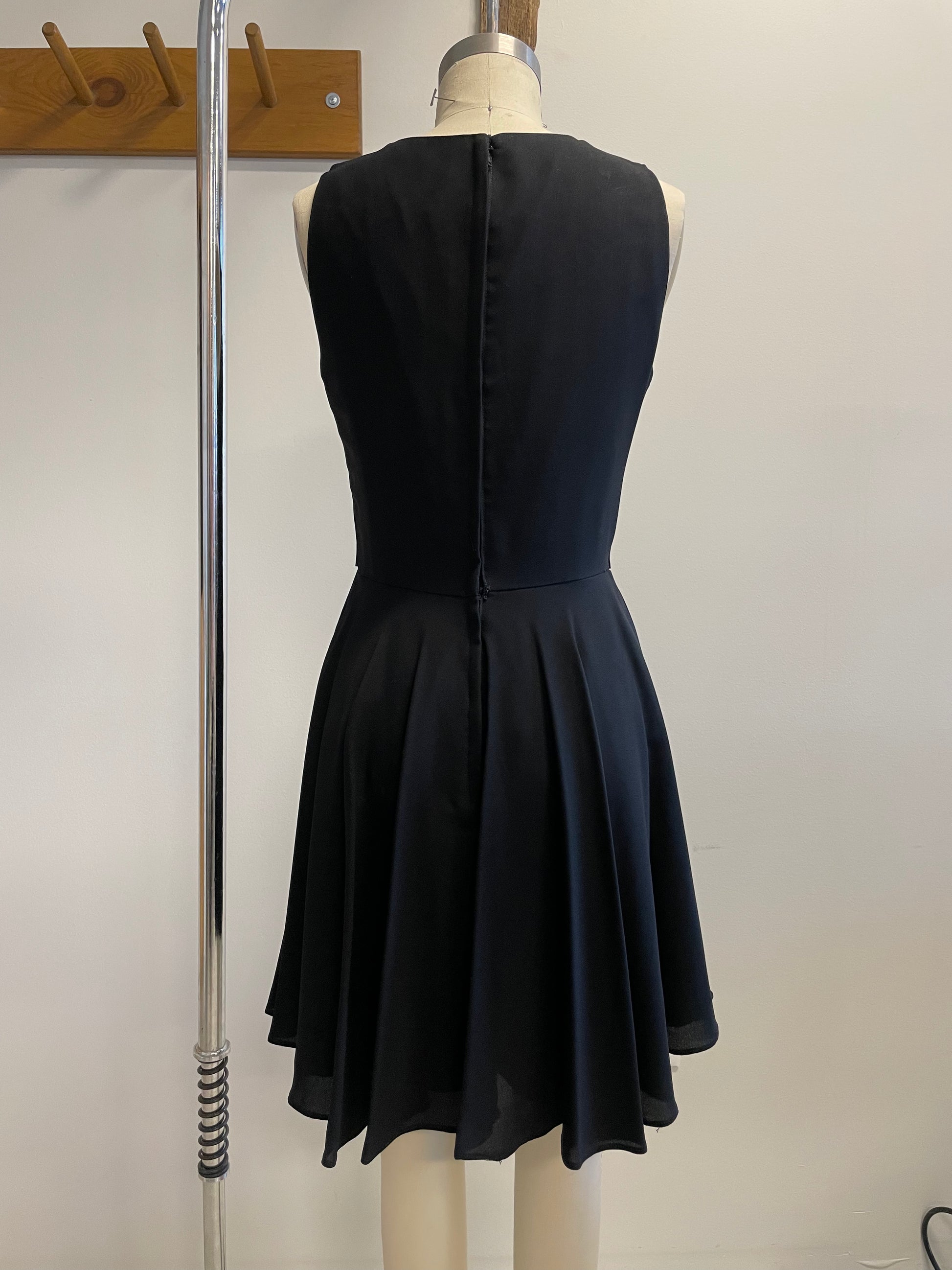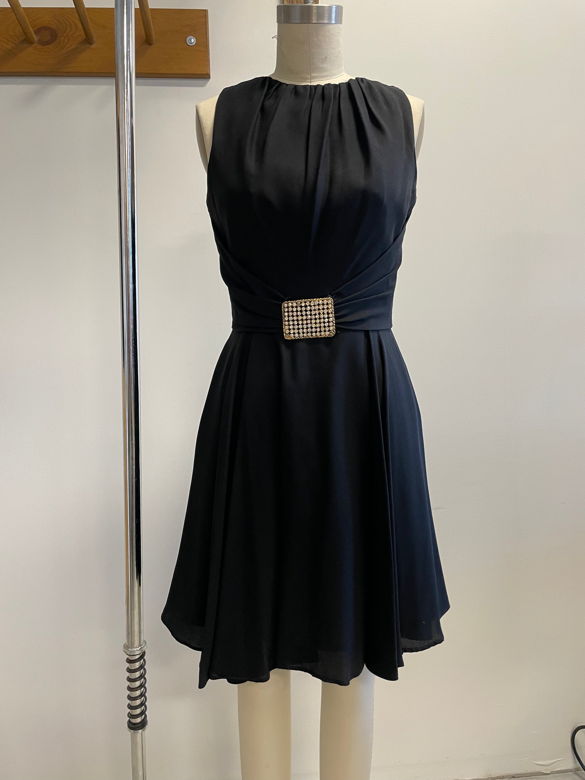 Black Chiffon sleeveless dress with round basic neckline drape detailing.