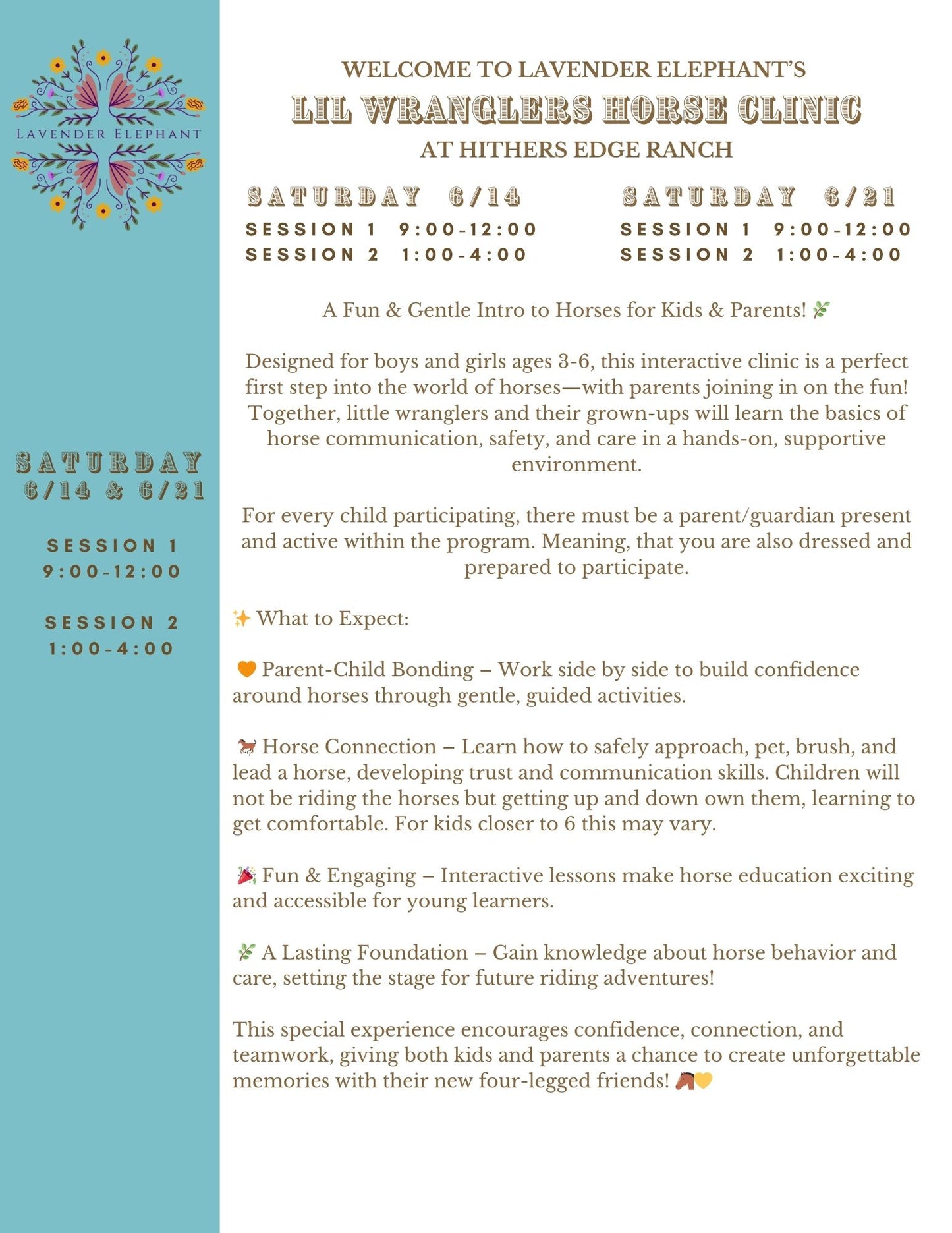Designed for boys and girls ages 3-6, this interactive clinic is a perfect first step into the world of horses—with parents joining in on the fun! Together, little wranglers and their grown-ups will learn the basics of horse communication, safety, and care in a hands-on, supportive environment.